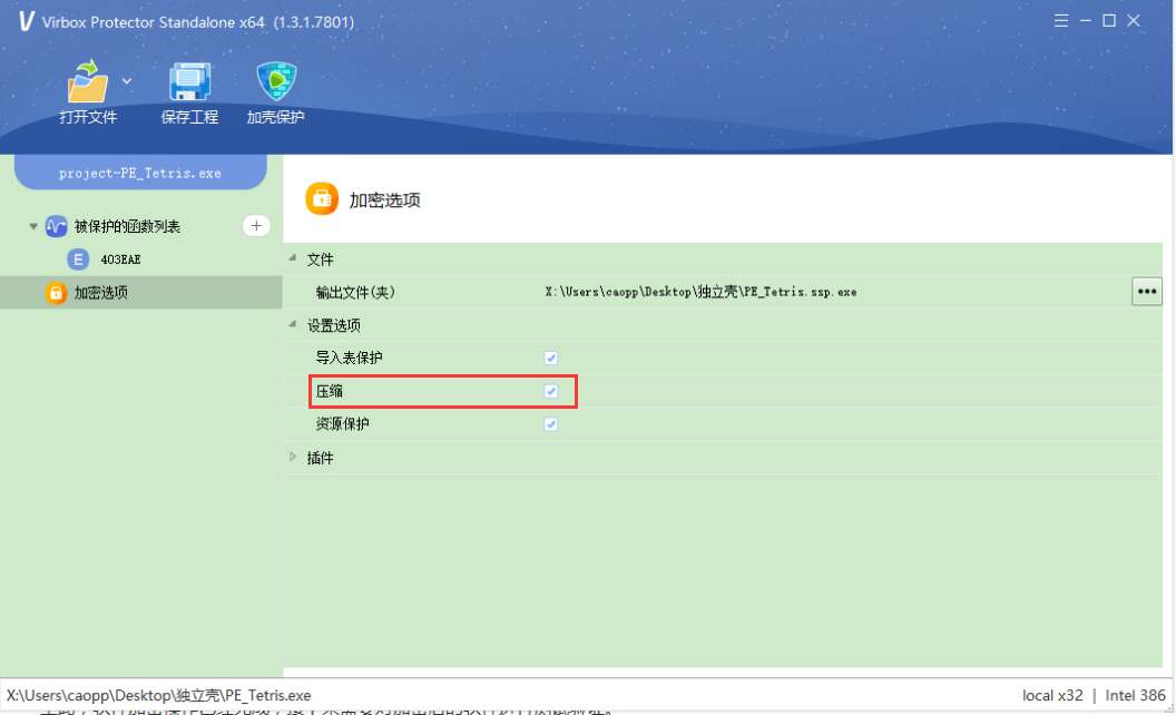 加密选项的区域可以在整体程序的范围上进一步的保护。针对PE程序,建议勾选 “压缩” 功能,可以增加软件的安全性,加壳工具的其他详细功能见 独立版外壳