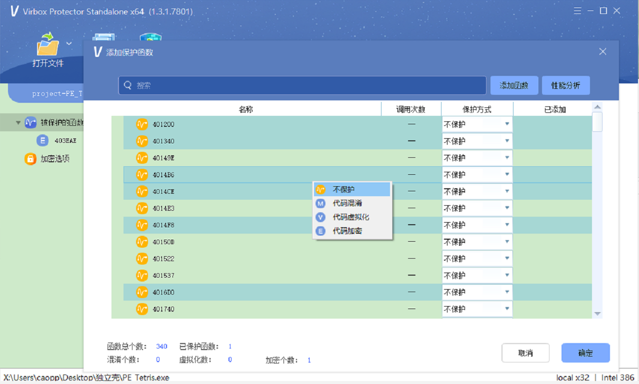 点击 “+” 按钮,加壳工具会对软件进行预分析,并列出所有分析到的函数。之后通过在函数列表后面的下列列表中选择相应的保护方式。为了演示只随机选择了一些函数进行保护。